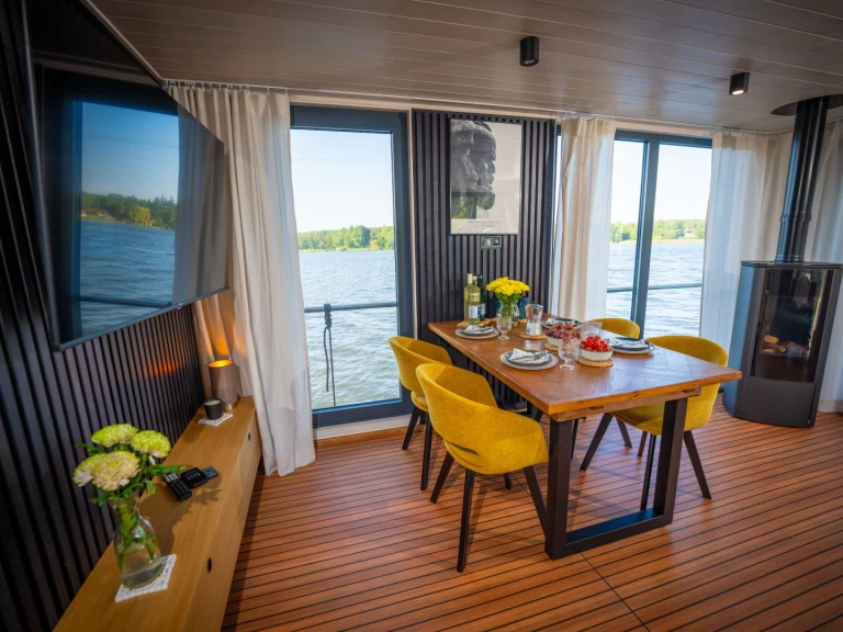 Das führerscheinfreie Hausboot ist modern eingerichtet und verfügt über 48 Quadratmeter Wohnfläche. Mit der leistungsstarken Heizung sowie einer Klimaanlage kann das Boot ganzjährig genutzt werden und bietet auch an kühleren Tagen eine gemütliche Atmosphäre. Alle unsere Hausboote sind mit einem WLAN-Router und Smart-TV ausgestattet.