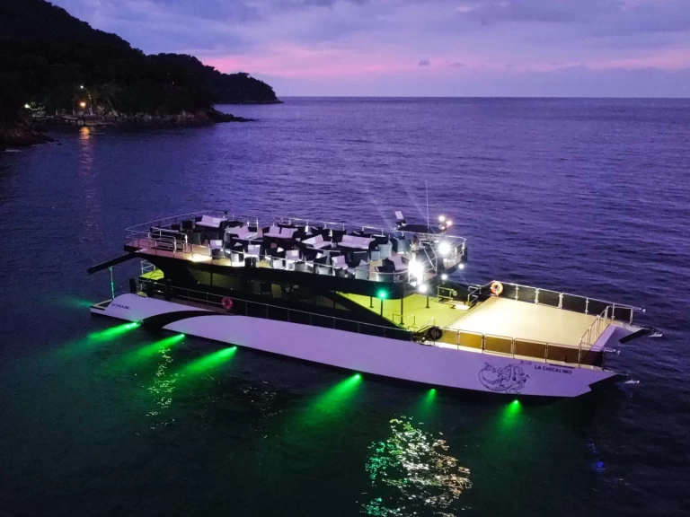 Capable of hosting private events for up to 185 people, this yacht is equipped with snorkeling gear and all the water toys you can imagine, promising endless excitement. With modern bathrooms and spacious areas to move and dance, you'll enjoy spectacular views of whales and the beautiful Bay of Banderas.